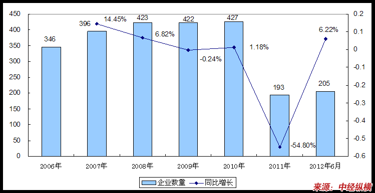 2006-2012年6月笔制造 行业 企业数量及其同比增长率