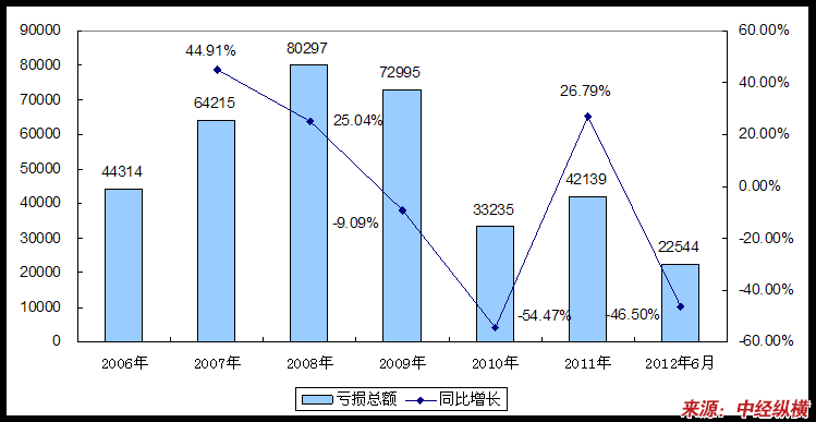 2006-2012年6月笔制造 行业 亏损总额及其同比增长率