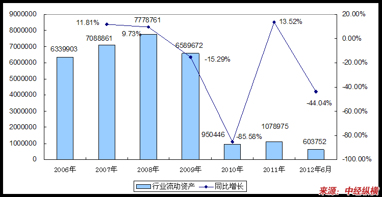 2006-2012年6月笔制造 行业 流动资产及其同比增长率