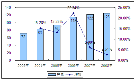 2003-2008年我国不饱和聚酯树脂生产规模及增长统计