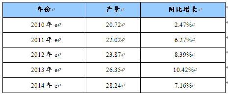 2010-2014年我国氨纶产业规模及同比增长预测表 单位:万吨