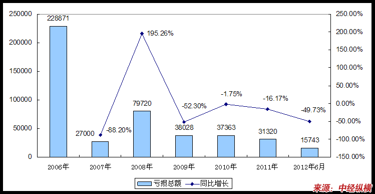 2006-2012年6月金冶炼 行业 亏损总额及其同比增长率