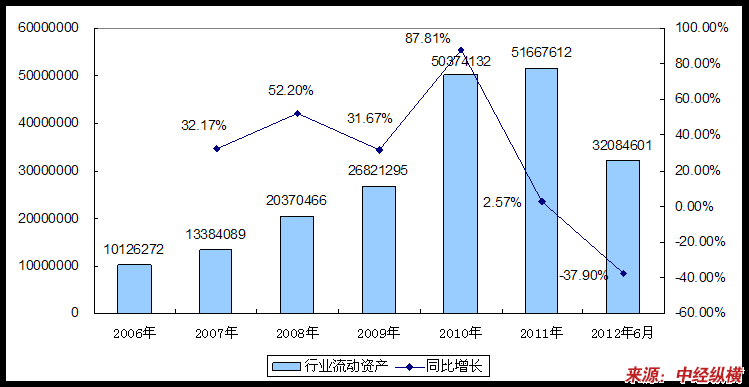 2006-2012年6月金冶炼 行业 流动资产及其同比增长率