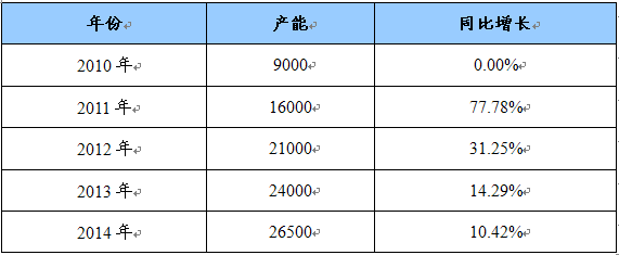 2010-2014年我国I+G产能增长预测表 单位:吨