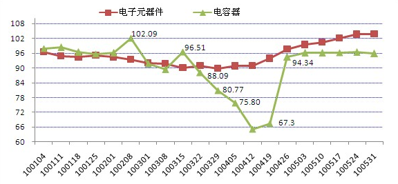 2010年1-5月份电子市场的大体走势,与去年预期相差并不太大,一季度电子市场整体价格呈现温和上涨,涨价主要原因是缺货。缺货现象在今年3、4月份反映更明显,导致部分型号有价无市,部分型号呈现翻番的涨价,从而促使电子市场价格指数在3、4月份明显上升走势。今年头5个月,电容器的价格指数呈现V型走势,价格在4月中旬出现强力反弹现象,旗下众多型号,出现大面积涨价。今年一季度开始,电子 行业 掀起缺货潮,而4、5月份缺货不但没得到改善,反而出现更严重现象。电容器总指数上涨幅度出现20多个点的反常现象,缺货及有意囤货惜卖让部分型号价格翻翻。