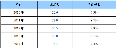 2010-2014年我国离子交换树脂需求量及同比增长预测表