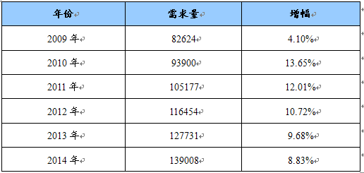 2009-2014年我国PVC夹网材料需求量预测 单位:万平方米