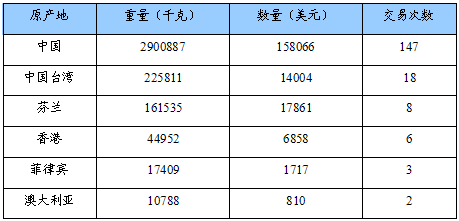 美国2011年9月从全球采购展示架(display展示架、道具rack)展示架、道具184次,供应商来自全球6个国家或地区,其中向美国出口展示架(display展示架、道具rack)的出口国或地区主要是: