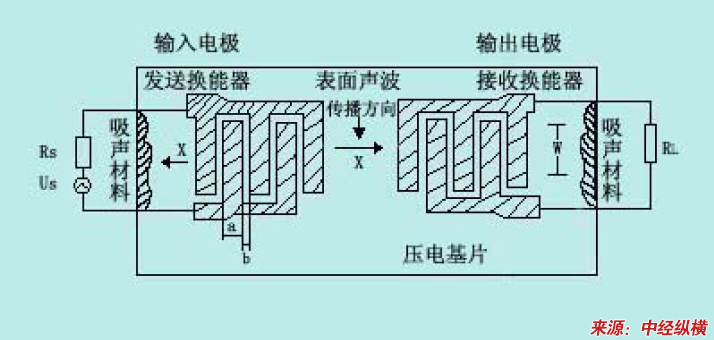 声表面波滤波器(SAWF)的结构如下图所示。这种滤波器的基片是由压电材料(如铌酸锂或石英晶体)制成,在基片上蒸镀两组“叉指电极”,一般由金属薄膜用光刻工艺刻成。左侧接信号源的一组称为发送换能器,右侧接负载的一组称为接收换能器,图中a、b分别为电极宽度和极间距离,W为相邻叉指对的重叠长度,称为“叉指孔径”。当交变的电信号us加到发送换能器的两个电极上时,通过反压电效应,基片材料就会产生弹性形变,这个随信号变化的弹性波,即“声表面波”,它将沿着垂直于电极轴向(图中x方向)向两个方向传播,一个方向的声表面波被左侧的吸声材料吸收,另一方向的声表面波则传送到接收换能器,由正压电效应产生了电信号,再送到负载RL。但叉指换能器的形状不同时,滤波器对不同频率信号的传送与衰减能力就会不一样。