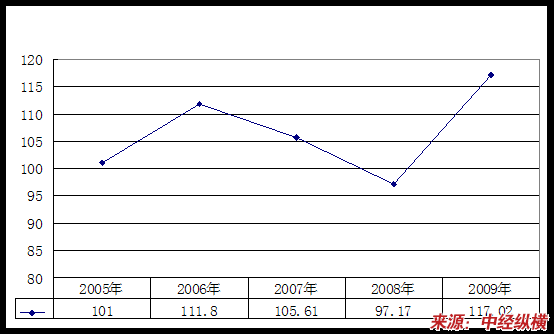 以一级沸石为例,进行 分析 ,2009年,国产4A沸石一级品价格在5200元/吨,下图以2004年指数=100进行统计,下图显示了我国4A沸石一级品价格变动趋势。