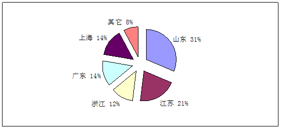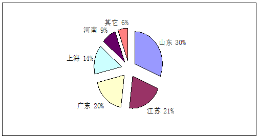 5-羟甲基糠醛主要产区有:山东、江苏,浙江,广东,上海等地,其中山东葡萄糖的产量最大,其次是江苏和广东。