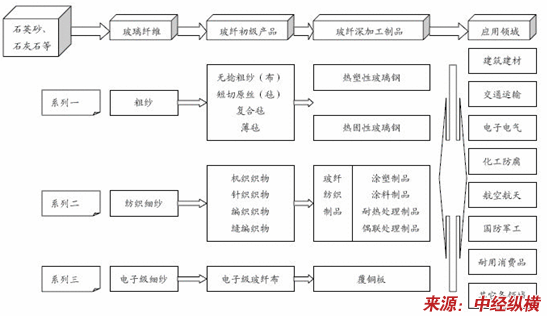 目前玻纤产业已形成从原材料、玻纤、玻纤初级产品、玻纤深加工制品的一个完整产业链。