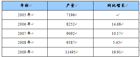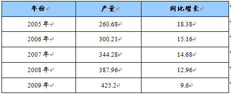 2005-2009年我国精炼铜产量增长统计表 单位:万吨