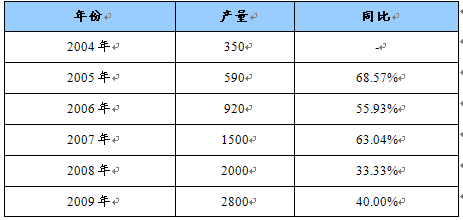 2004-2009年我国Low-E玻璃产量统计表 单位:万平方米