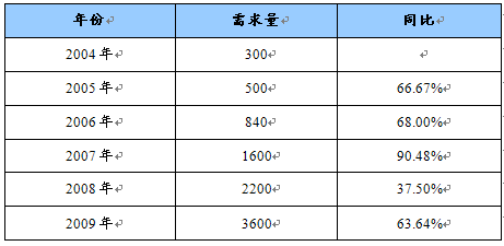 2004-2009年我国Low-E玻璃需求量统计表 单位:万平方米
