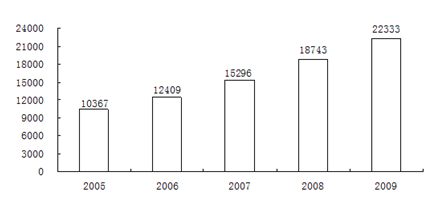 2005-2009年我国建筑业增加值情况 单位:亿元