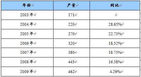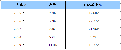 2005-2009年汽车制造业产量增长情况统计表 单位:万辆