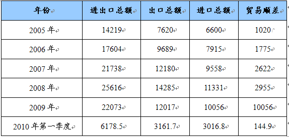 2005年-2010年我国对外贸易基本情况 单位:亿美元