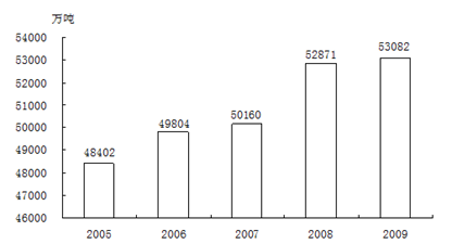 2009年全年粮食种植面积10897万公顷,比上年增加217万公顷;全年粮食产量53082万吨,比上年增加211万吨,增产0.4%。