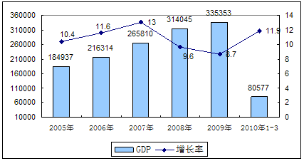 初步测算,2009年全年国内生产总值335353亿元,按可比价格计算,比上年增长8.7%,增速比上年回落0.9个百分点。2010年一季度国内生产总值80577亿元,按可比价格计算,同比增长11.9%,比上年同期加快5.7个百分点。