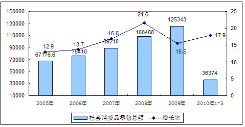 2009年,全年社会消费品零售总额125343亿元,比上年增长15.5%。2010年一季度,社会消费品零售总额36374亿元,同比增长17.9%,比上年同期加快2.9个百分点。