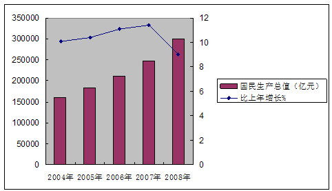 2008年国内生产总值300670亿元,比上年增长9.0%。分季度看,一季度增长10.6%,二季度增长10.1%,三季度增长9.0%,四季度增长6.8%。分产业看,第一产业增加值34000亿元,增长5.5%;第二产业增加值146183亿元,增长9.3%;第三产业增加值120487亿元,增长9.5%。