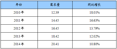 2010-2014年我国冻干食品产品需求量及同比增长预测表