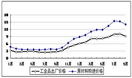 生产资料价格涨幅高位回落。9月份,流通环节生产资料价格比上月下降2.4%,已连续2个月环比下降;同比上涨17.5%,涨幅比上月回落5个百分点。工业品出厂价格同比上涨9.1%,比上月回落1个百分点;原材料、燃料、动力价格上涨14%。
