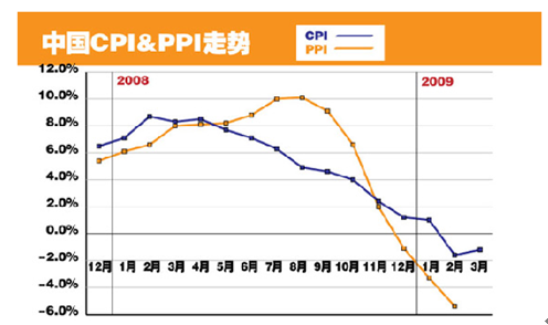 2008-2009年一季度我国CPI&PPI走势图