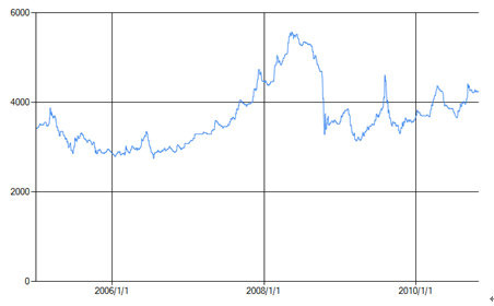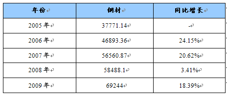 2007年时钢材价格走势的均价为4100多元/吨,2008年钢材价格走势为5000元/吨左右。2009年的钢材价格走势平均约为4355元/吨。