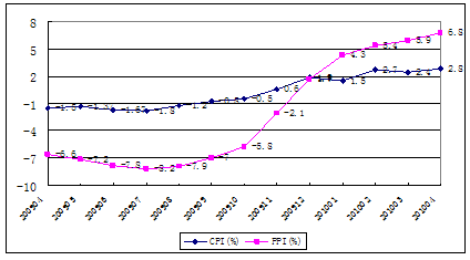 中国为工业主导型经济,经济发展情况主要取决于第二产业的发展情况。2009年全年规模以上工业增加值比上年增长11.0%,增速比上年回落1.9个百分点。其中,一季度增长5.1%,二季度增长9.1%,三季度增长12.4%,四季度增长18.0%。工业增加值增速逐步加快,表明在政府经济刺激计划的带动下工业正稳步好转。从各 行业 表现看,受政府投资强力拉动以及国际市场基础资源价格大幅反弹的影响,黑色金属、非金属、其他矿采选业等资源开发类 行业 处于相对较高水平;而食品、纺织、化学原料制造等轻工业业绩增长则相对平缓。值得关注的是,以水泥、钢铁等为代表的非金属矿物制品业、黑色金属冶炼及压延加工业,产能过剩依然明显,其生产增速的集中大幅提高有可能导致相关产品价格未来面临进一步下行压力。