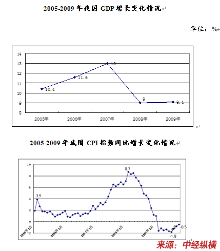 在采取了一系列的宏观调控政策之后,中国的经济有所抬头,经济总体运行良好。2009年第三季度,中国宏观经济继续保持了第二季度以来的企稳回升势头,国民经济运行的积极因素逐渐增多,四季度增长10.7%。2009年全年国内生产总值335353亿元,按可比价格计算,比上年增长8.7%,增速比上年回落0.9个百分点。