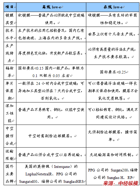 2、产品按生产工艺分离线低辐射镀膜玻璃和在线低辐射镀膜玻璃。