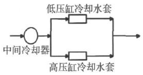 综合上述两种冷却形式,对压缩机可采取混联式冷却,图所示。采用该形式冷却,冷却水先流过中间冷却器,冷却管线内气体再分别流向高低压气缸冷却水套及气缸。这样可充分利用冷却水而又不会对设备造成隐患。