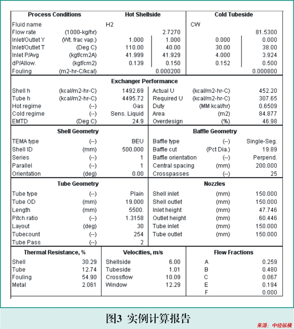 该冷却器原始数据为:标态流量30300Nm3/h,进气温度40℃,气体成分:氢气,相对湿度1.0;压缩气体由110℃冷却至40℃,要求压降小于0.015MPa;冷却水温度由30℃升至38℃,允许最大压降0.05MPa;气/水侧污垢系数:0.0002/0.0008m2•h•℃/kcal;冷却器中气体压力4.2MPaA。