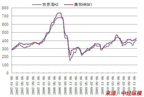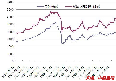 2007年1月~2010年11月废钢、螺纹钢走势对比图