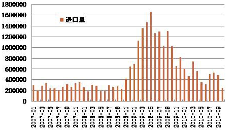 2007年1月~2010年10月我国废钢铁进口量统计示意图