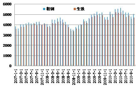 2007年1月~2010年10月我国生铁、粗钢月度产量统计
