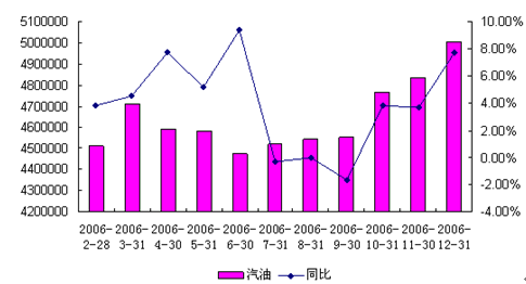 2006年汽油产量变化与国际原油价格的变化有着非常明显的一致性。2006年前半年国际原油价格一路高涨,国内汽油产量也出现了下降的态势,波动非常剧烈。年中以后,国际原油价格加速上涨,汽油产量出现了非常大的降幅,尤其是从6月份稻月份,国内汽油产量下降幅度最大,随后汽油产量略有回升。在9月份国际原油价格下跌以后,国内汽油产量开始加速上升,尤其是从11月份开始产量上升的幅度更大,国内炼油企业也在11月份开始实现盈利。