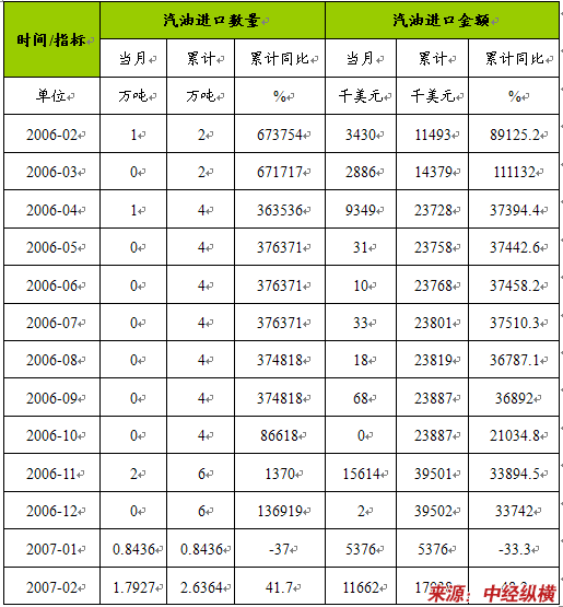 2005年国内汽油需求减缓以及国内外市场价格倒挂促进了汽油出口。2005年9月1日至12月31日,国家暂停了汽油11%的出口退税,2006年国家继续控制汽油出口,从3月14日开始再次暂停了11%的汽油出口退税,使得炼厂出口汽油的积极性降低。2006年,汽油出口量降至350.54万吨,较2005年大幅下降了37.77%。