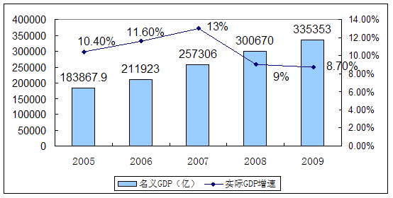 2009年国内生产总值335353亿元,比上年增长8.7%。分产业看,第一产业增加值35477亿元,增长4.2%;第二产业增加值156958亿元,增长9.5%;第三产业增加值142918亿元,增长8.9%。第一产业增加值占国内生产总值的比重为10.6%,比上年下降0.1个百分点;第二产业增加值比重为46.8%,下降0.7个百分点;第三产业增加值比重为42.6%,上升0.8个百分点。