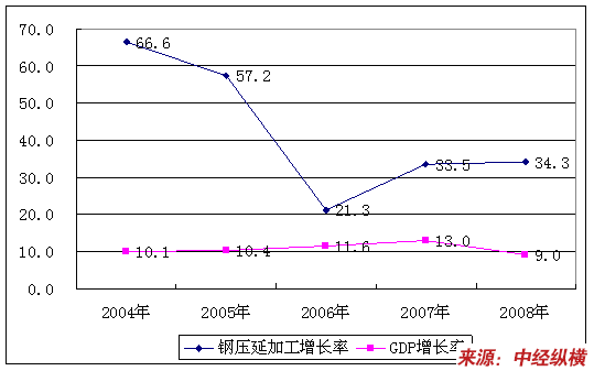 从图中可以看出,超薄板所属的钢压延加工 行业 与与国家宏观经济环境相关程度较大,随着GDP的增加,产值增加, 行业 工业总产值增长率高于国家GDP增长率, 行业 前景看好。