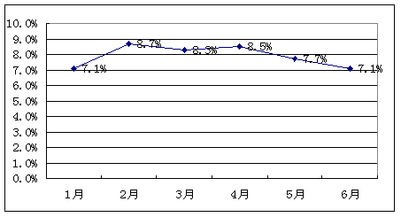 同时,上半年工业品出厂价格(PPI)同比上涨7.6%。从3月份8%、4月份8.1%、5月份8.2%到6月份8.8%,PPI连续四个月处于8%的涨幅平台。生产价格涨幅继续扩大,对CPI也形成了较大的传导压力。
