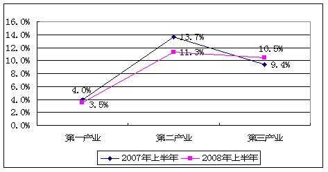 2007、2008年上半年国民产业同比增长率比较