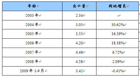 2003-2009年9月我国窗帘出口量统计表 单位:亿件