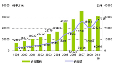 1999年-2009年全国住宅销售面积和销售额