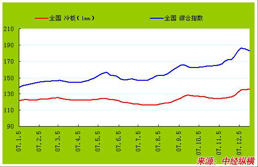 2007年12月与11月相比,八个主要钢材品种价格呈现全面上涨走势。其中:普线和螺纹钢指数分别上升9.23点和7.87点,价格每吨分别上涨318元和277元,达到4528元/吨和4619元/吨,为历史较高水平。板材产品中热轧板卷价格上涨明显,其指数上升7.4点,价格每吨上涨284元,达到4910元/吨。中厚板、热薄板、冷薄板价格和镀锌板都呈上涨态势,指数分别上升6.73点、5.43点5.95点和3.63点,价格每吨上涨246元、224元290元和188元。由于原料供应紧张和年终部分钢厂集中停产检修,致使11月份全国冷、热轧板带产量环比出现回落,使国内板材资源供给增长相对减缓。无缝管价格稳中有升,其指数上涨4.61点,价格每吨上升213元。