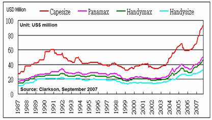 2007年,散货船引领国际造船市场,成为国际造船市场持续兴旺的主要因素。据英国业界统计,2007年中国承接新船订单中,散货船成交量为8,150万载重吨,占世界市场份额的55.8%;韩国承接3,730万载重吨,占25.5%;日本承接1,640万载重吨,占11.2%;欧洲承接480万载重吨,占3.3%。中国散货船成交量跃居世界第一。其中,17万至20万载重吨级好望角型散货船承接130艘/2,307万载重吨,占世界市场份额40%;20万吨以上矿砂船20艘/550万载重吨,占世界市场份额44%。