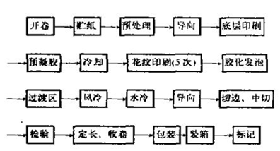 另外,桂林市第三塑料厂开发了圆网涂布印刷聚氯乙烯壁纸生产技术。圆网印花壁纸生产线工艺流程如下图所示。