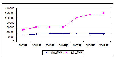 2003-2009年不锈钢厨餐具进出口价格走势 单位:元/吨